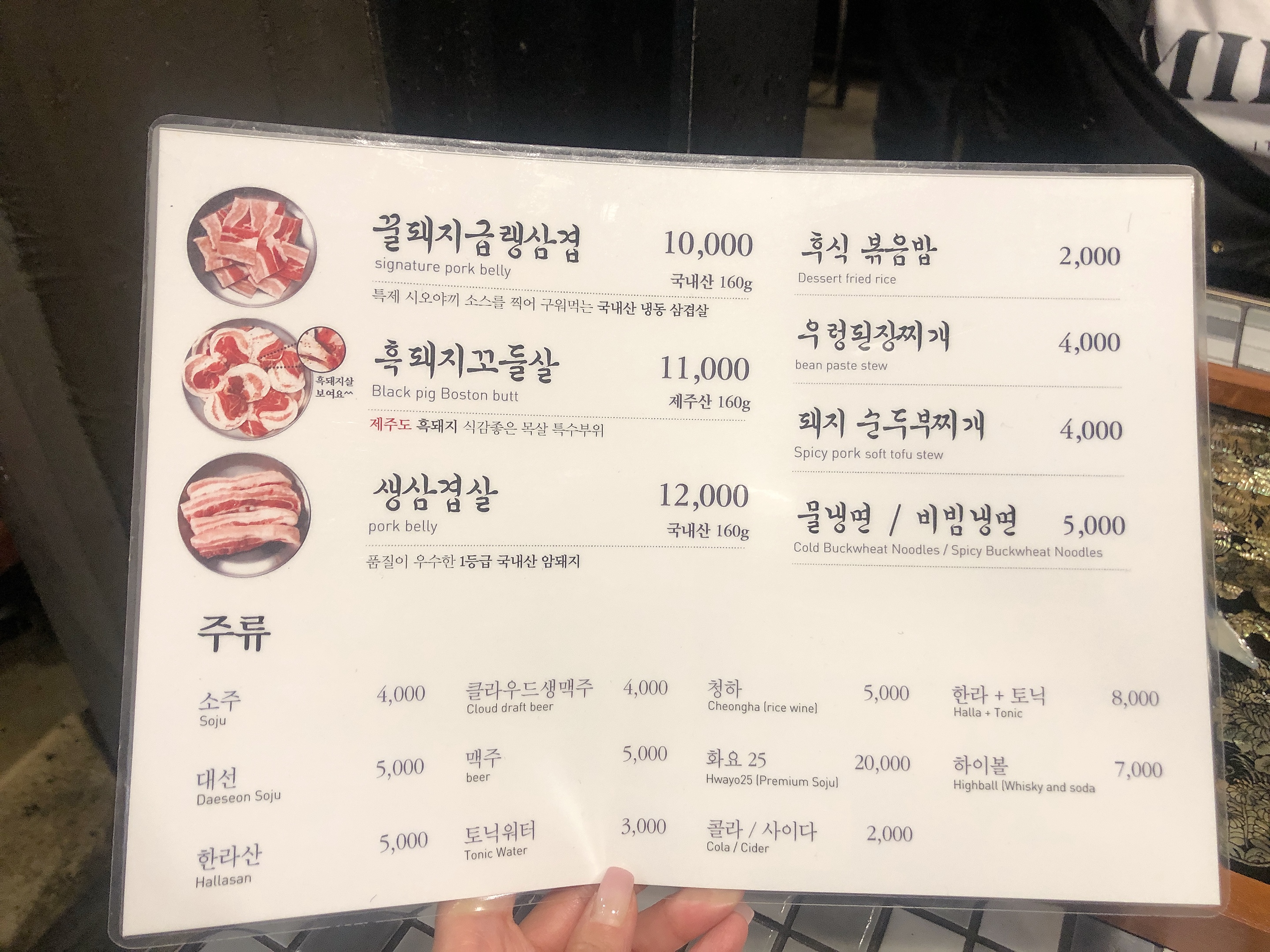 우리는 꿀돼지 급냉삼겹살을 주문했다. 그리고 찌개도. 그리고 맥주도.. 흑돼지 꼬들살도.. (아래설명)