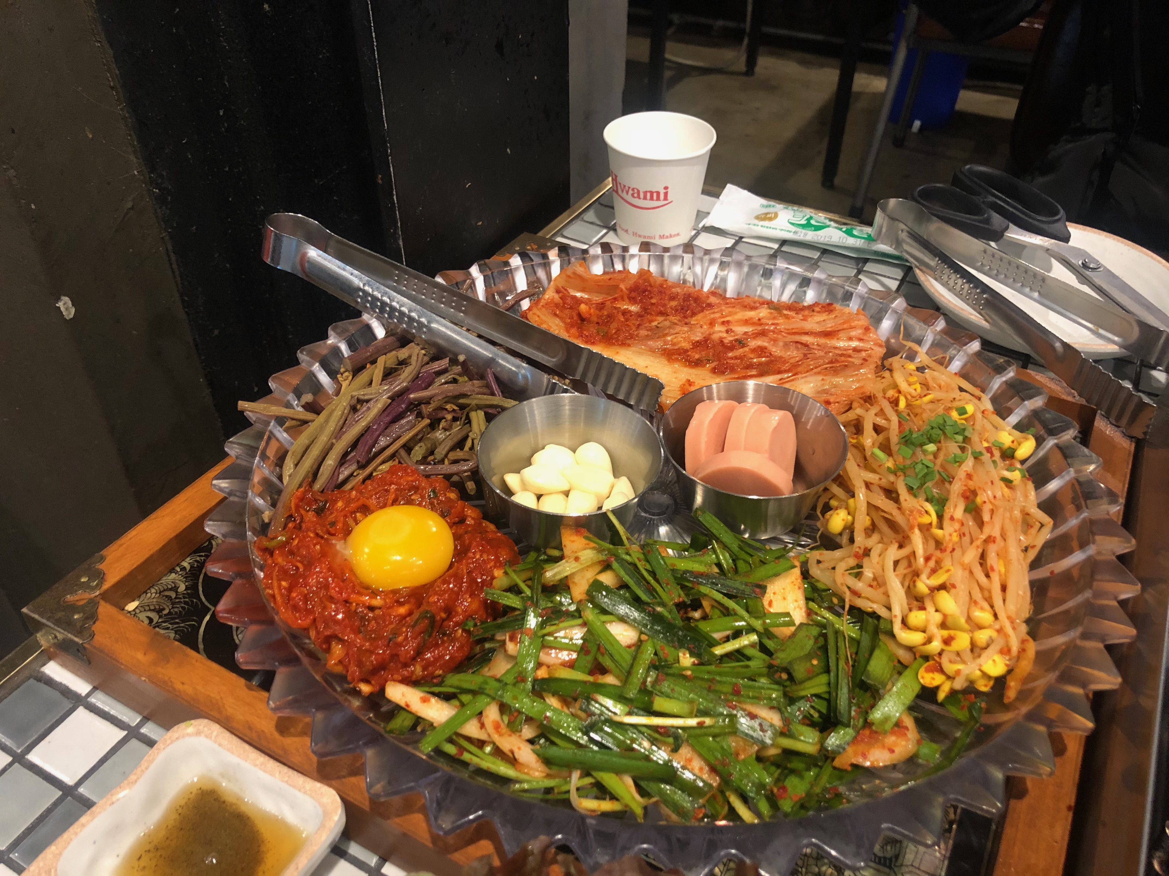 마늘과 햄, 콩나물, 김치 등등 넉넉하게 기본찬이 나와서